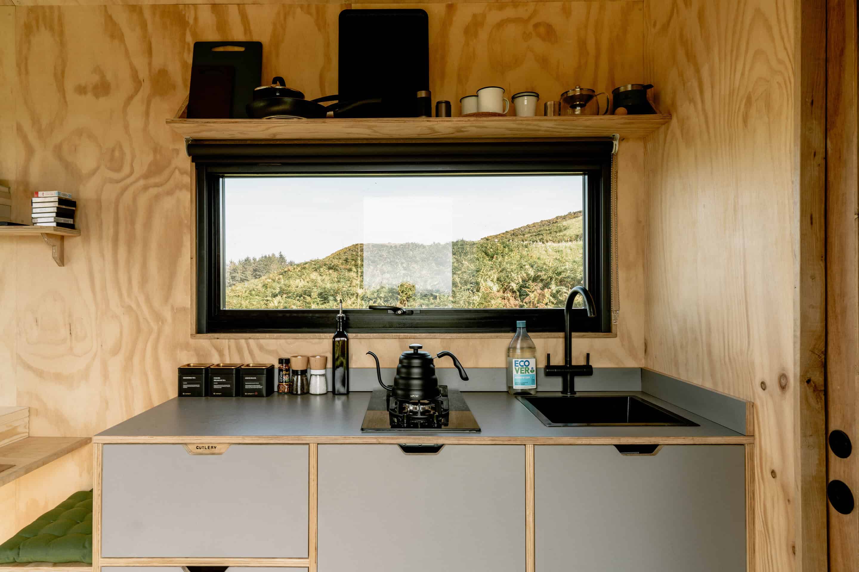 Inside, Hoku is warm and minimal, with a plush king-sized bed, soft linens, a crackling log burner, and thoughtful touches throughout — organic teas, rich coffee, natural toiletries, and a curated selection of books and games. It’s a cabin built for comfort, simplicity, and deep rest.